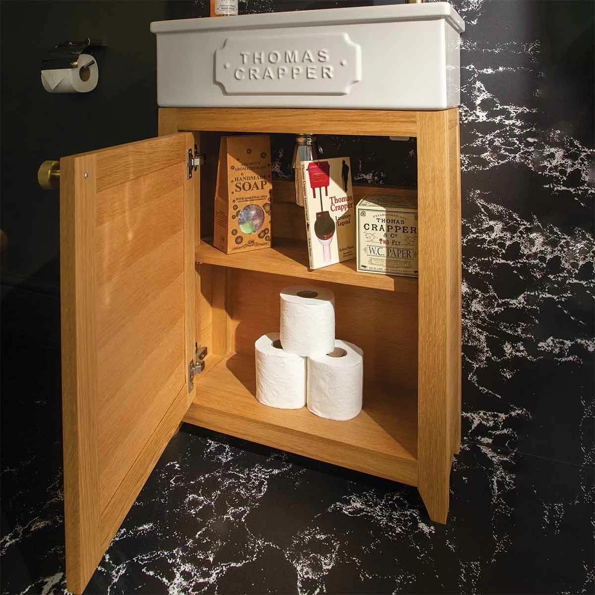 The Thomas Crapper Bentham Cloakroom Unit & Basin is 570mm wide and only has a depth (front to back) of only 250mm. Suited ideally to the most compact of cloakrooms, whilst giving practical storage for the necessary items inside the cabinet. The substantial fireclay basin is supported by a very solid, oak vanity.