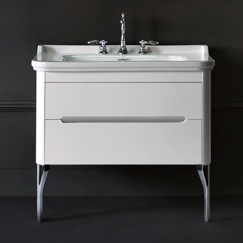 The Waldorf 100cm washbasin and cabinet is available with legs or as a wall-hung unit. This stunning piece will become a versatile focal point for your bathroom as it compliments both traditional and contemporary bathroom interiors. This vintage-style bathroom furniture is built to last and is backed by a 15-year guarantee. This art deco 100cm basin offers refined elegance that recalls the geometry of bathroom fixtures installed in historic hotels opened by William Waldorf Astor, in nineteenth-century New York.